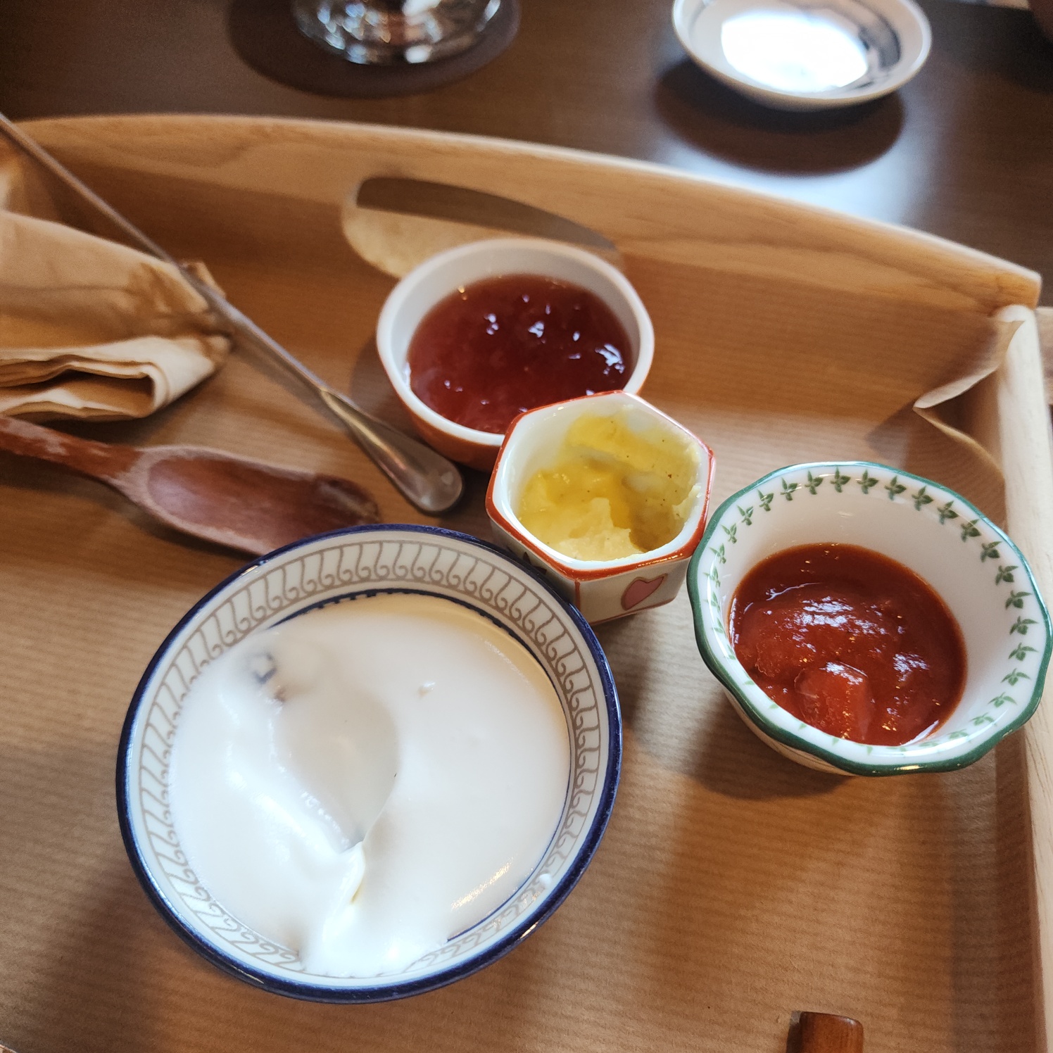 그냥 먹어도 부드럽지만 살짝 구워서 같이나오는 딸기잼, 생크림, 토마토소스, 버터,반숙 중에